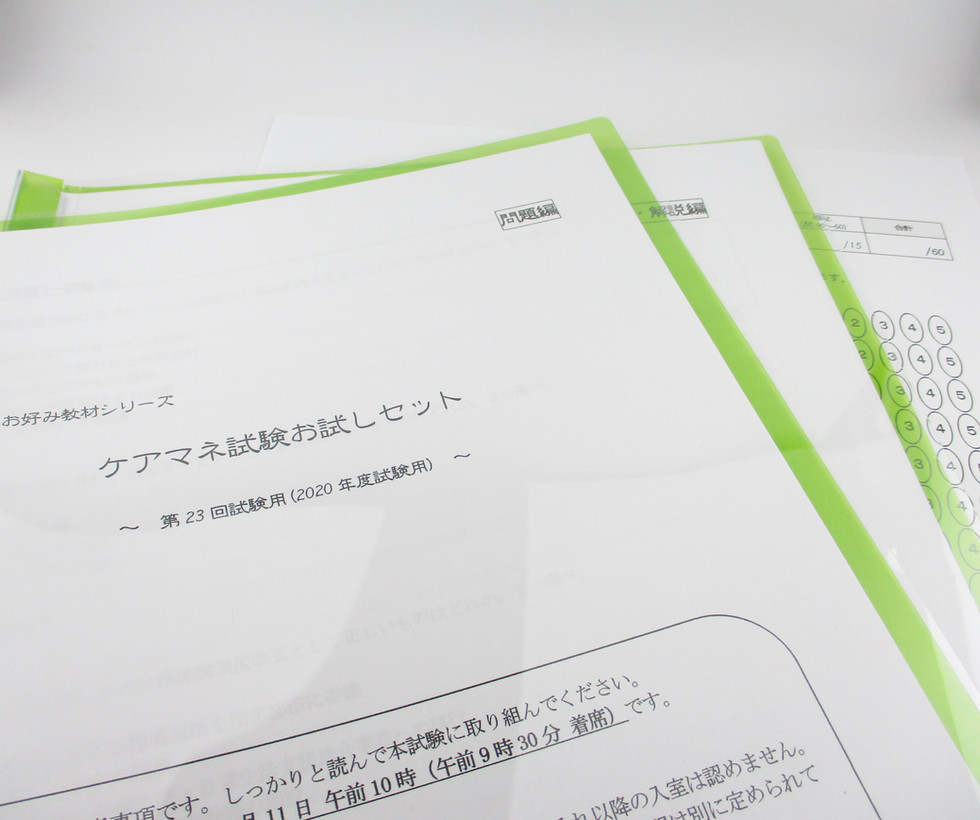 「ケアマネ試験お試しセット」販売開始福祉試験対策工房2020年7月31日読了時間: 1分福祉試験対策工房より福祉試験対策工房では、新作の「ケアマネ試験お試しセット」を本日より、本店およびBASE店で販売開始しました。本教材は、2020年度用(第23回試験用)の予想模試です。本試験と同様、全60問、五肢複択方式での出題となっています。試験直前期の実力試しに「お試しセット」いかがでしょうか。今回は、本店とBASE店での販売で、各50部(計100部)の限定販売とさせて頂きます。どうぞよろしくお願い申し上げます。BASE店の販売ページ → こちら